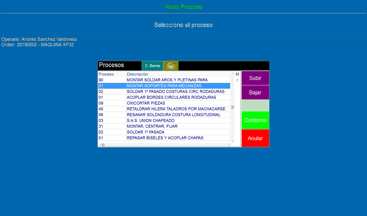 erp maquinaria captura Tactil datos Inicio de Proceso